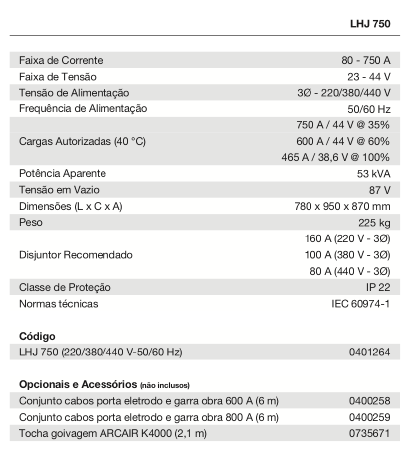 LHJ 750 é um retificador com característica de corrente constante para soldagem no processo eletrodo revestido
